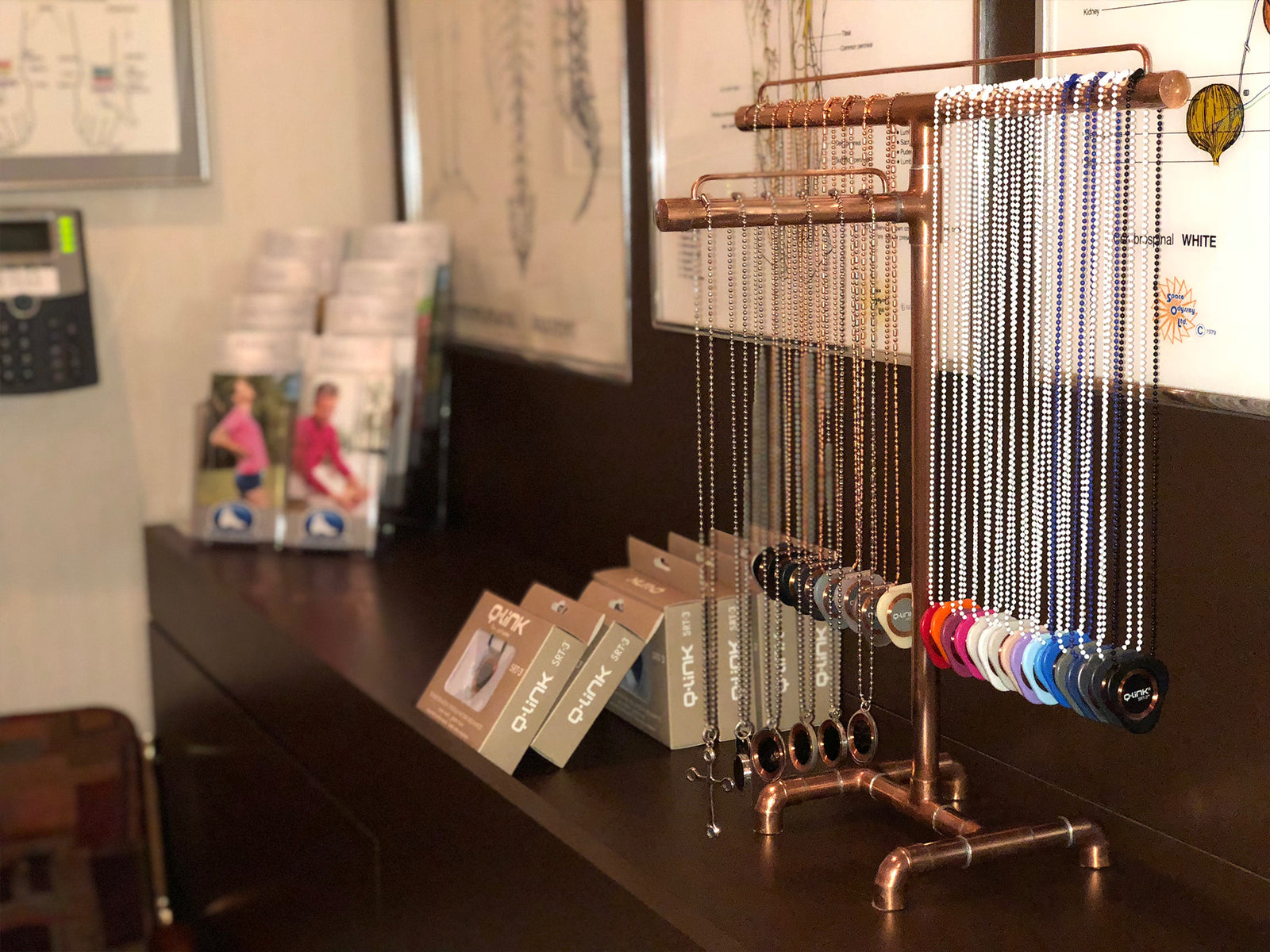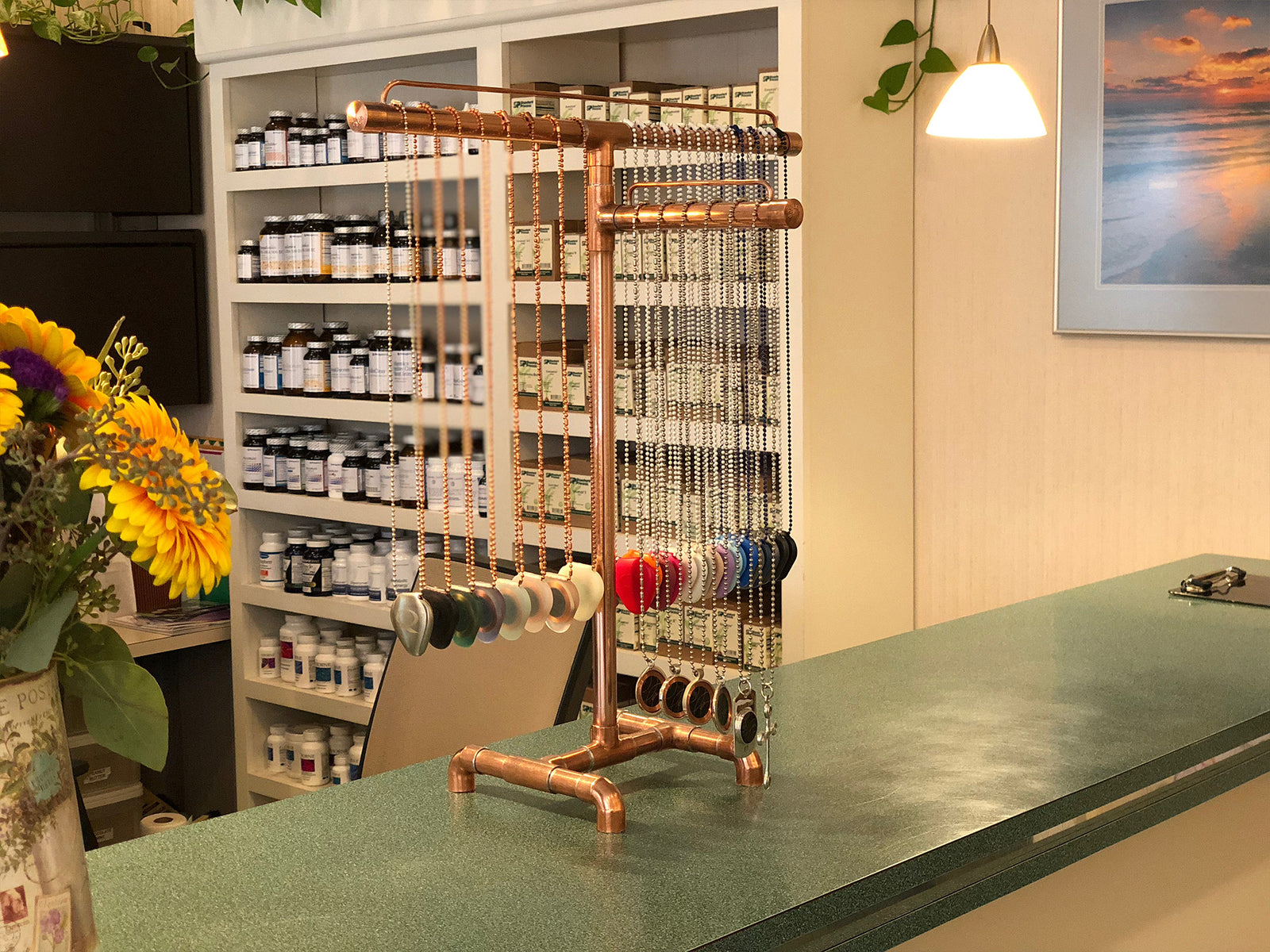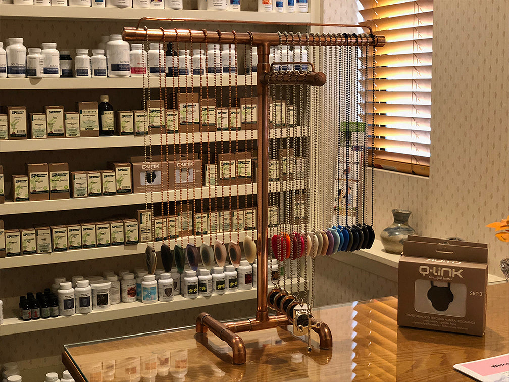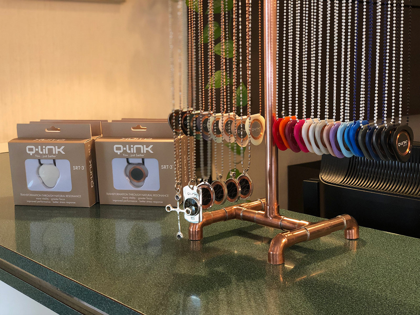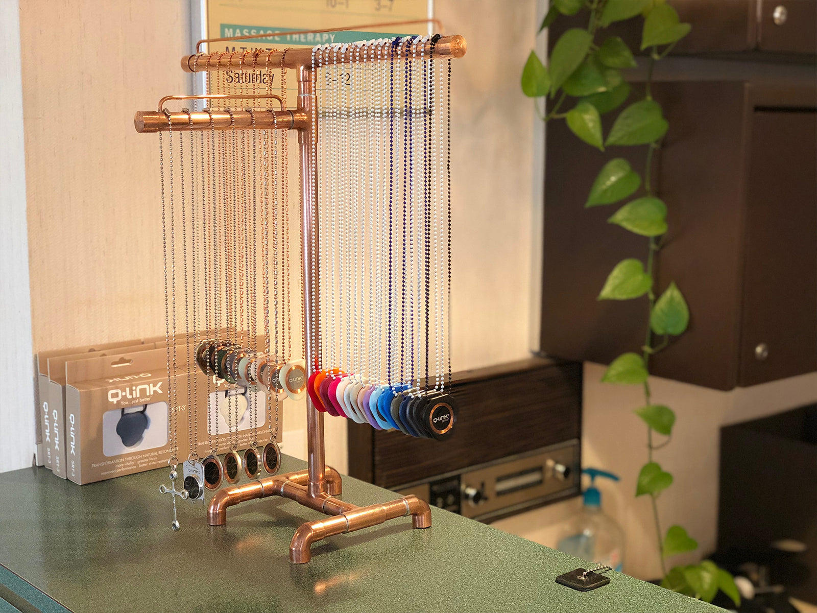 Our all-copper Q-Link display simply and beautifully presents and complements any selection of Q-Link Pendants, and is an effective catalyst for introducing your patients, clients and customers to the life-enhancing, transformational benefits of Q-Link. It's also an eye-magnet, inviting questions and unearthing new opportunities to create a dialogue on the importance of the body's energetic and the vital role Q-Link plays in its condition and function. Plus, it's compact, easy to move about, has a small footprint and is a charming addition to most any office or retail space or motif. Integrated security bars keep sample products tastefully tethered, while still inviting and allowing patrons to get up close and personal with the selections. Sample pendants can also be easily detached by a staff member should a potential customer wish to try on a favorite. Browse the below images to see how this display might look in your store, spa, office, clinic, patient/consult room, customer waiting area, at seminars and in other sales or event related environments: