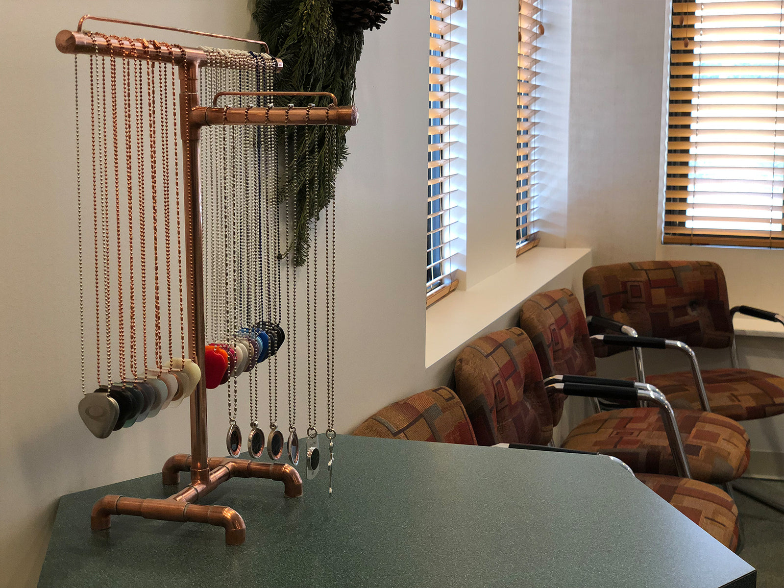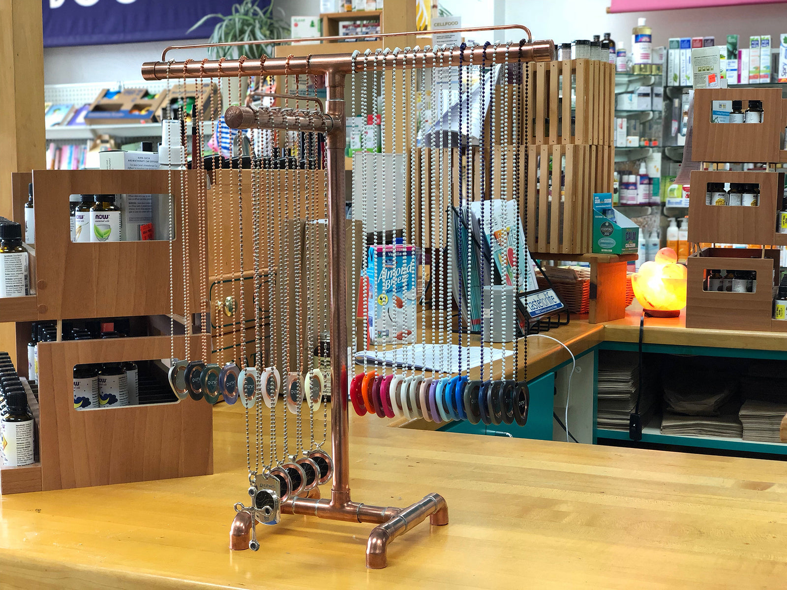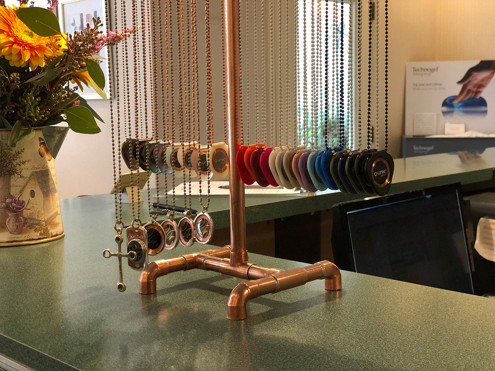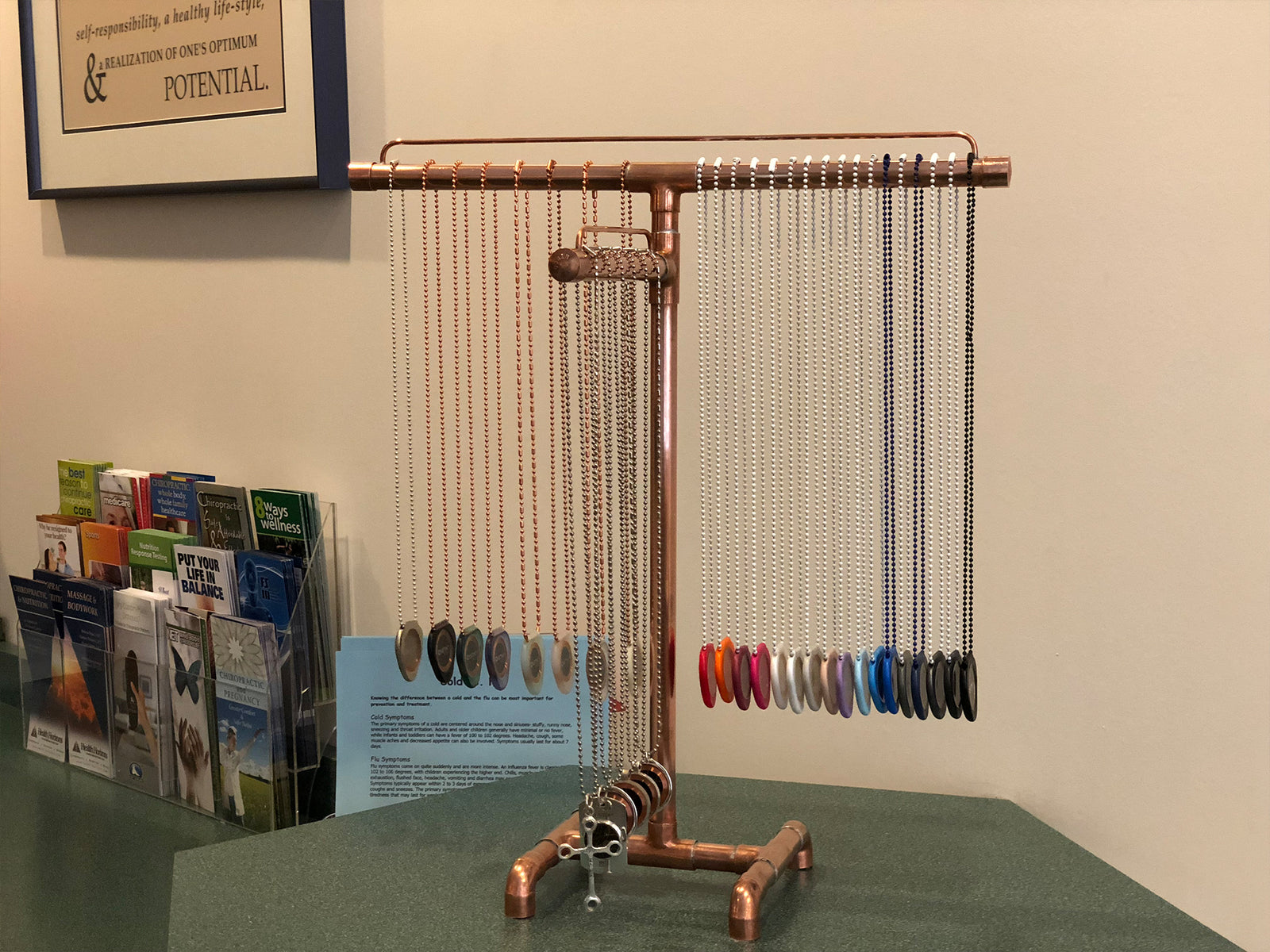 Our all-copper Q-Link display simply and beautifully presents and complements any selection of Q-Link Pendants, and is an effective catalyst for introducing your patients, clients and customers to the life-enhancing, transformational benefits of Q-Link. It's also an eye-magnet, inviting questions and unearthing new opportunities to create a dialogue on the importance of the body's energetic and the vital role Q-Link plays in its condition and function. Plus, it's compact, easy to move about, has a small footprint and is a charming addition to most any office or retail space or motif. Integrated security bars keep sample products tastefully tethered, while still inviting and allowing patrons to get up close and personal with the selections. Sample pendants can also be easily detached by a staff member should a potential customer wish to try on a favorite. Browse the below images to see how this display might look in your store, spa, office, clinic, patient/consult room, customer waiting area, at seminars and in other sales or event related environments: